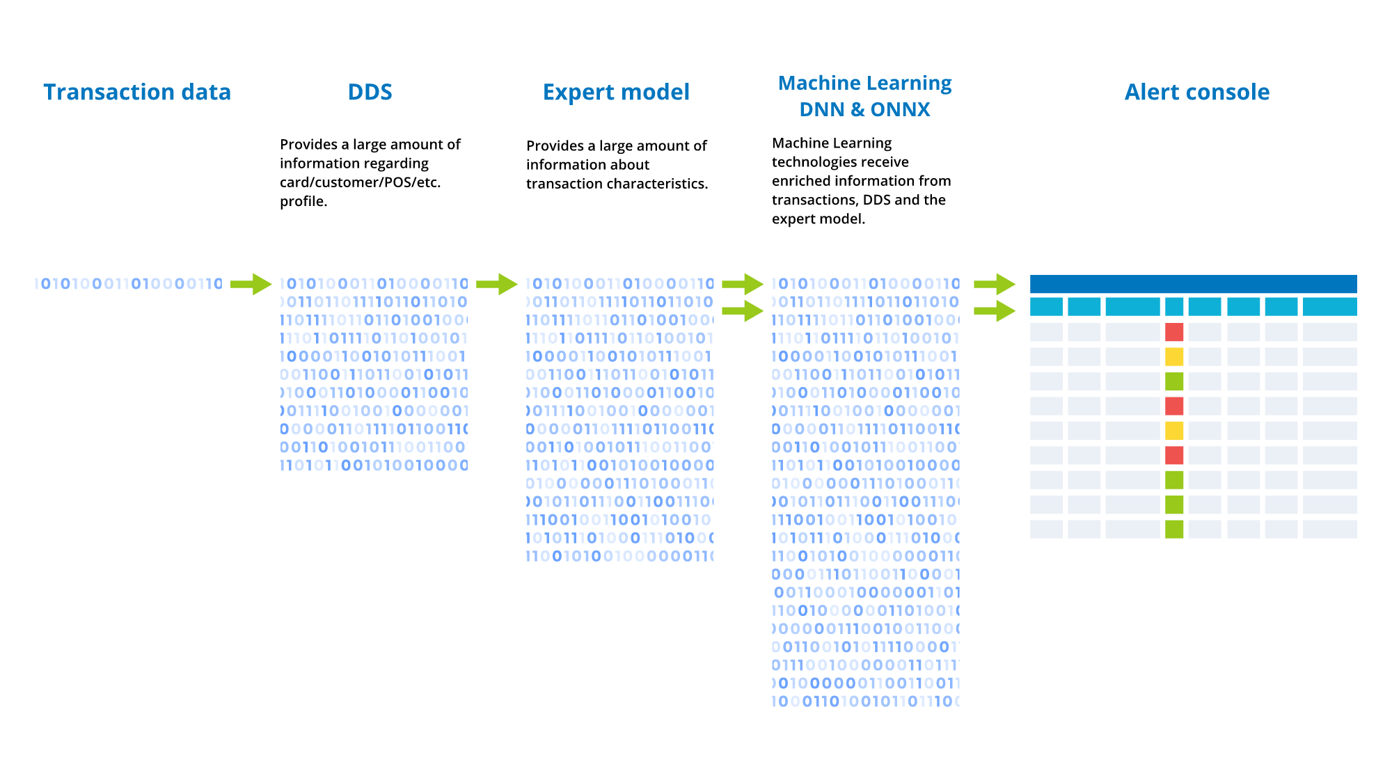 Un modelo de experto con más de 20 años de experiencia y madurez que contiene todo el aprendizaje obtenido durante el apoyo a más de 400 instituciones financieras en los 5 continentes. Este modelo de experto brinda a las tecnologías de Machine Learning información precisa sobre las características de la transacción que se está analizando.